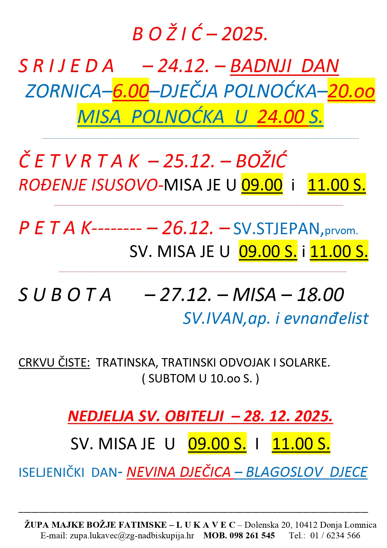 ADVENTSKI KONCERT KUDa STARI GRAD9. prosinca 2025. Objavljuje Lukavec 24. prosinca 2025. Kategorije Obavijesti Župa Lukavec Oznake Podijeli1 Lukavec Povezano9. prosinca 2025.ADVENTSKI KONCERT KUDa STARI GRADPročitaj Više5. studenoga 2025.Obavijest o isplati božićnice umirovljenicima i korisnicima nacionalne naknadePročitaj Više2. rujna 2025.Provedba katastarske izmjere: Šiljakovina i LukavecPročitaj Više Odgovori Otkaži odgovorVaša adresa e-pošte neće biti objavljena. Obavezna polja su označena sa * (obavezno)Komentar * (obavezno) Ime * (obavezno) E-pošta * (obavezno) Web-stranica Spremi moje ime, e-poštu i web-stranicu u ovom internet pregledniku za sljedeći put kada budem komentirao. Δ